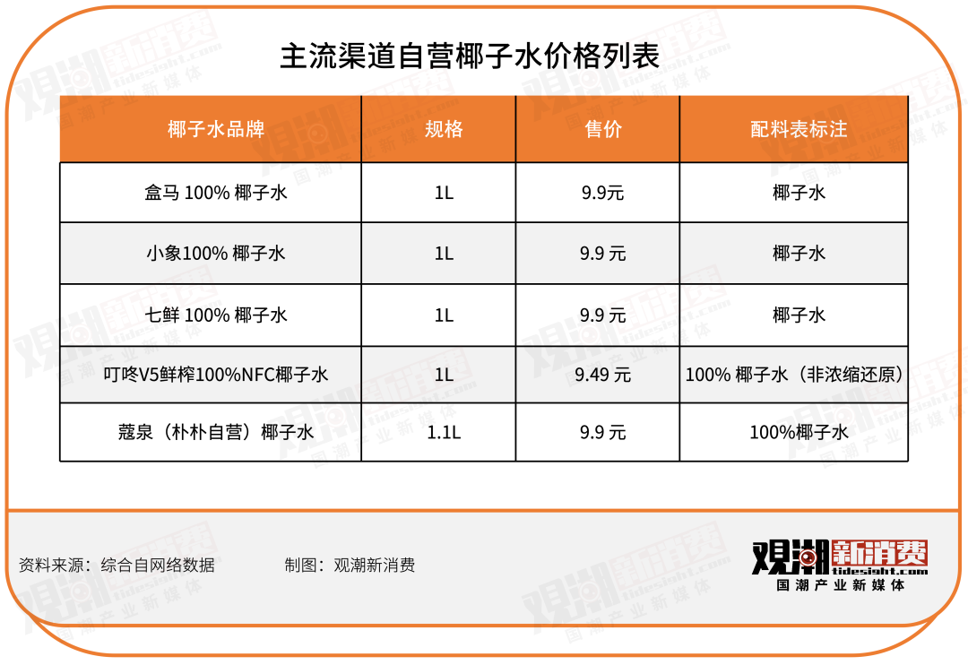 赛道一旦陷入内卷,“价格战”便应声而来。业内人士指出,椰子限定的环境决定了其原料采购、运输及储存环节均需承担高昂成本 —— 粗略计算,1L装纯正青椰水的成本一度在10元左右,但当下主流渠道的自营“100%椰子水”产品,售价却普遍锚定“9块9” 档位。